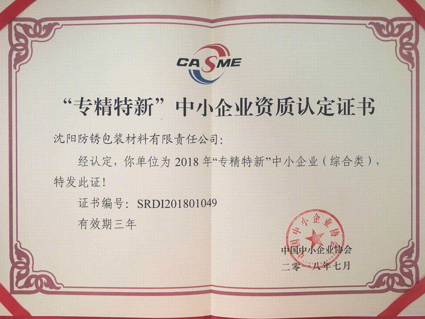 Recently, it was certified by the China Small and Medium Enterprises Association to grant the Shenyang Anti-rust "2018 "Specialized Special New SMEs" Certificate (Comprehensive). “Specialization and specialization” refers to industrial SMEs with the characteristics of “specialization, refinement, specialization and novelty”.