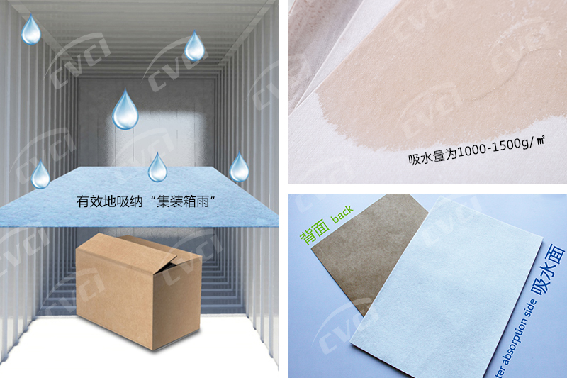 1.箱運(yùn)輸時(shí),將復(fù)合吸水紙放置集裝箱頂部及貨物關(guān)鍵部位,吸水面朝外;