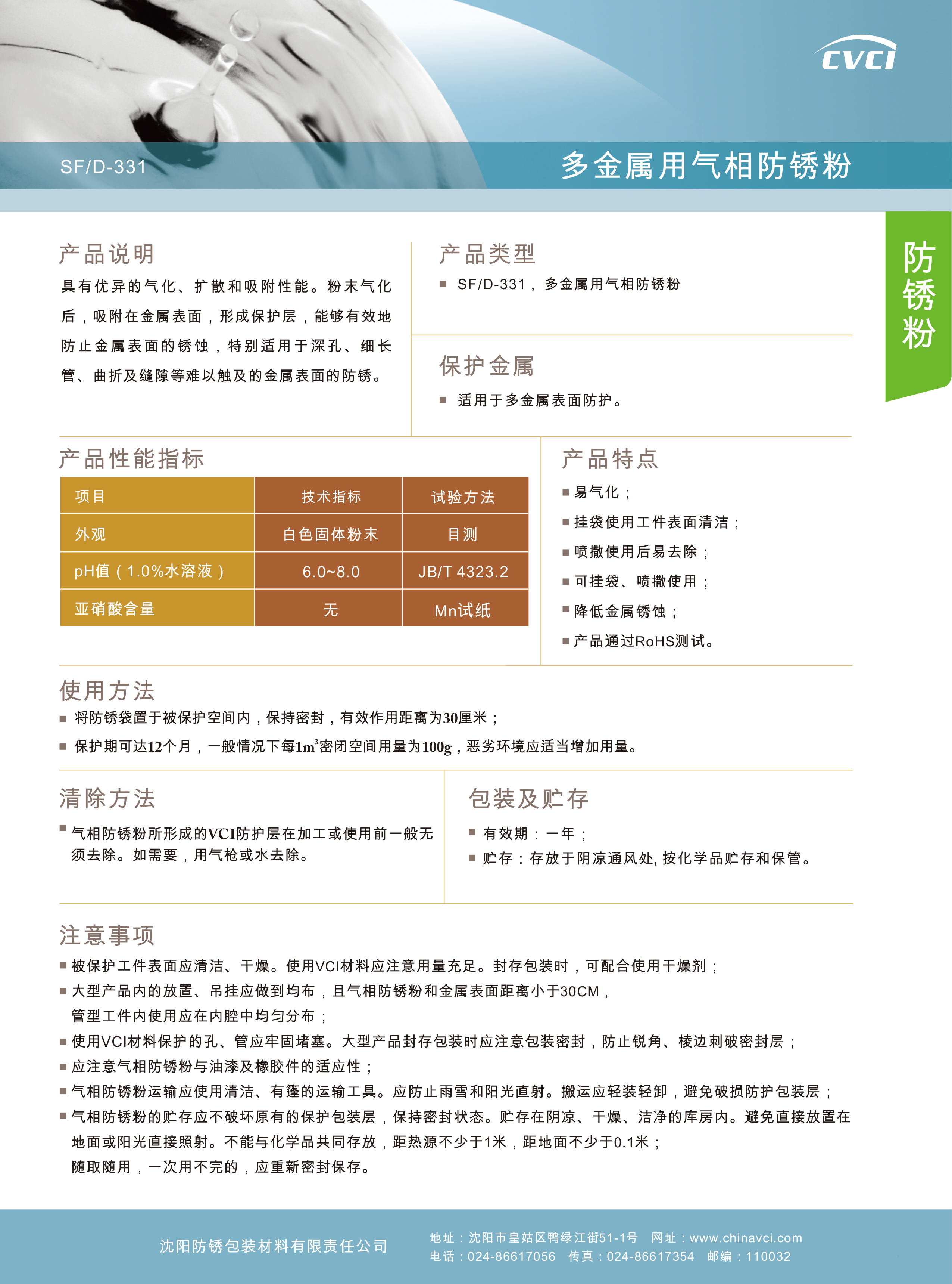 產(chǎn)品說明:多金屬用氣相防銹粉,具有優(yōu)異的氣化、擴(kuò)散和吸附性能。粉末氣化后,吸附在被保護(hù)金屬表面,形成保護(hù)層,能夠非常有效地防止金屬表面的銹蝕,特別適用于深孔、細(xì)長管、曲折及縫隙等難以觸及的金屬表面的防銹。