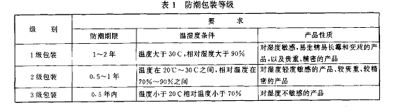 ①包裝的防潮等級應(yīng)根據(jù)產(chǎn)品的性質(zhì)、流通環(huán)境、儲運(yùn)時(shí)間、包裝容器的一般性能等因素來確定防潮包裝等級分為1級包裝、2級包裝、3級包裝,詳見表1。